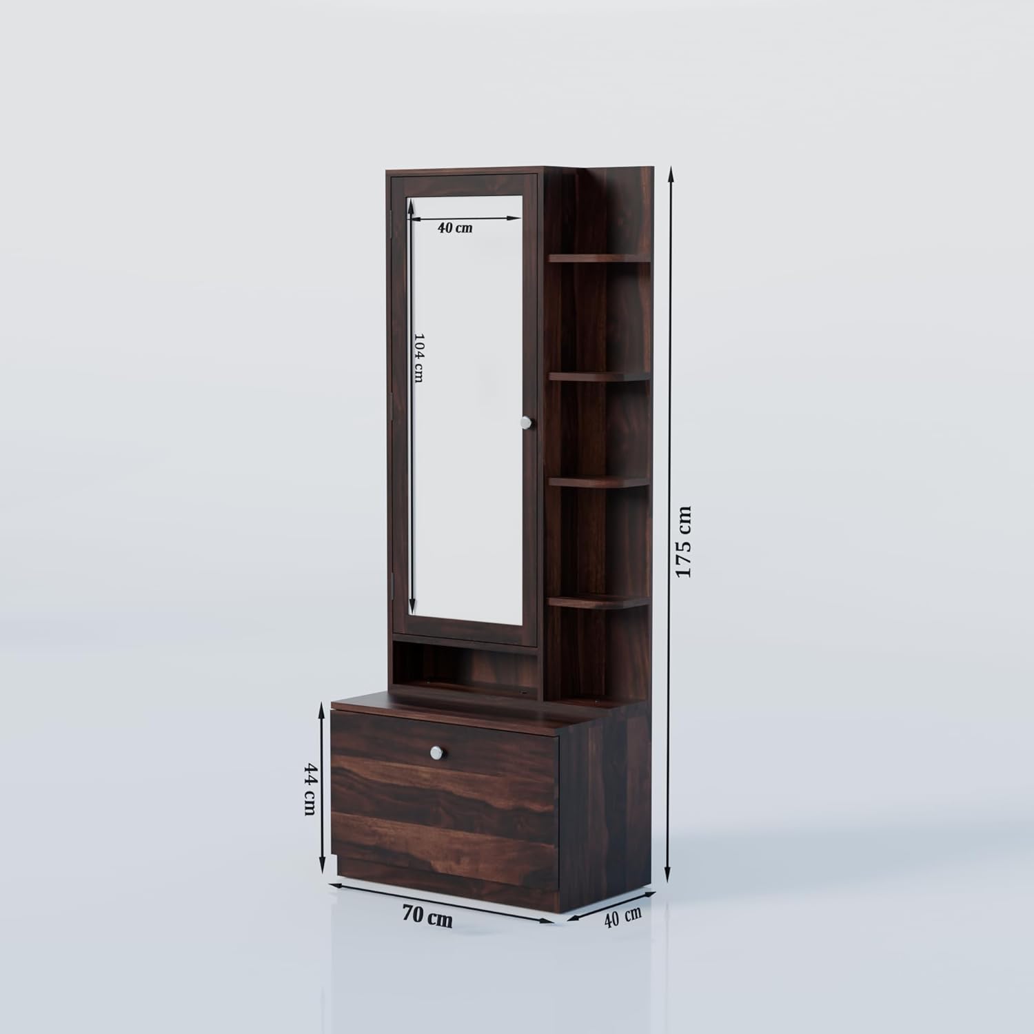 The Wood Dressing Table with Mirror and Storage is a perfect blend of elegance and functionality for your bedroom. Crafted from high-quality engineered wood with a rich walnut finish, it enhances your space with a modern touch. The large mirror provides a clear reflection, making daily grooming effortless. Featuring spacious drawers and open shelves, this dressing table offers ample storage for makeup, accessories, and essentials, keeping your space organized. The sturdy construction ensures durability, while the compact yet stylish design makes it suitable for any bedroom size. Ideal for makeup and grooming needs, this vanity dressing table combines practicality with aesthetics. Its smooth surface is easy to clean, and the drawer system ensures a clutter-free look. A must-have for an elegant bedroom setup!